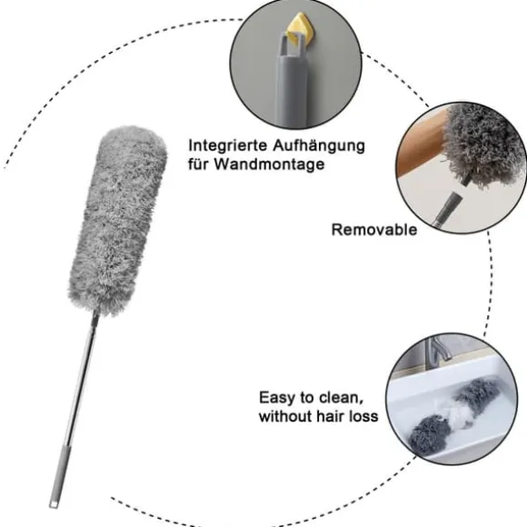 Den universella dammvippan rengör effektivt damm, spindelnät och hår och gör det i alla tänkbara positioner. Det teleskopiska handtaget gör att du enkelt når alla hörn, oavsett om det är på golvet eller i taket.