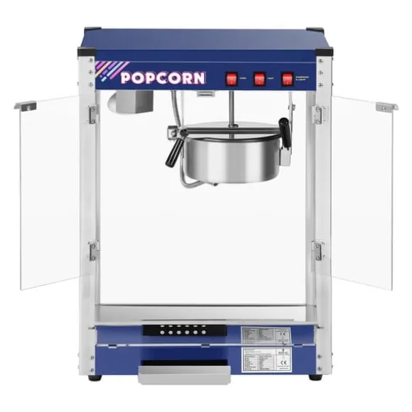 RCPR-1350 8 oz popcornmaskinen är utrustning som gör att du snabbt kan förbereda stora mängder popcorn. Stekcykeln för en portion på 150 g spannmål är bara 110 sekunder, vilket är ett exceptionellt bra resultat. Den maximala uppvärmningstemperaturen når 250°C och effekten är 1350 W. Funktionerna att värma, hålla varm och blanda popcorn ställs in med separata strömbrytare. Den härdade glaskammaren är upplyst inuti. Grytan med en kapacitet på 1350 ml har en teflonbeläggning. Enheten kännetecknas av enkel manövrering (magnetlås och gångjärnslåda) och lätt att rengöra (samla majs och oljerester).