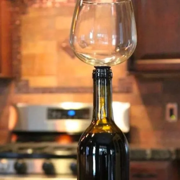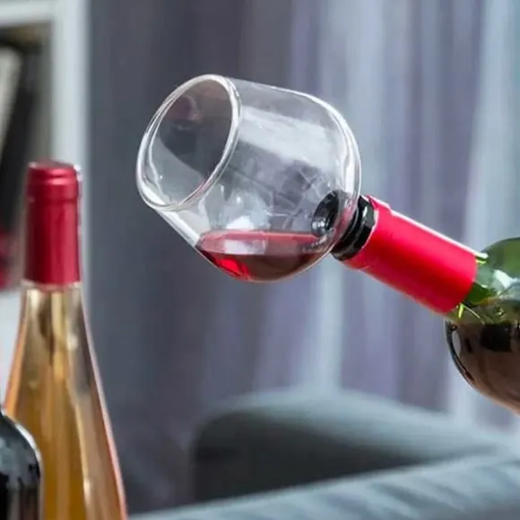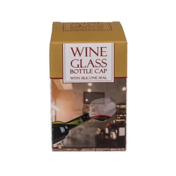 Propp i form av ett vinglas, H 13 cm. Denna original 2-i-1 flaskpropp kommer att vara idealisk för att förhindra att andra dricker ur din flaska eller för att förbli elegant under alla omständigheter. Angående proppens funktion: Öppna sedan flaskan placera glasproppen på halsen och drick till sist ur glaset genom att luta flaskan något. Denna propp har en silikonförsegling för att