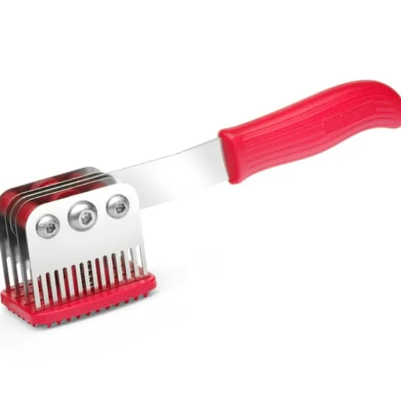 Producentkode: 513071 Victor-mærket kødmørner er en kombination af en kødmørner og en traditionel støder. Det nedbryder kødet perfekt og blødgør fibermassen og flader samtidig kødet ud. Den har 56 2,6 mm brede klinger lavet af rustfrit stål. Den maksimale snitdybde er cirka 18 mm. Produktegenskaber: – Kombination af en mørningsmaskine med en traditionel støder, – Nedbryder kød perfekt, blødgør den fibrøse masse og flader samtidig kødet ud, – 56 knive – 4 rækker af 14 knive, – Knive i rustfrit stål, – Blade bredde 2,6 mm, – Maksimal skæredybde ca. Tekniske data: – Produktnummer – 513071 – Artikeltilstand – Ny – Farve – Rød – Bladmateriale – Rustfrit stål – Antal knive – 56 – Knivbredde – 2,6 mm – Skæredybde – ca. 18 mm – Dimensioner – 280 x 57 x 70 mm – Vægt – 350 g Sættet indeholder: – Kokkens støder