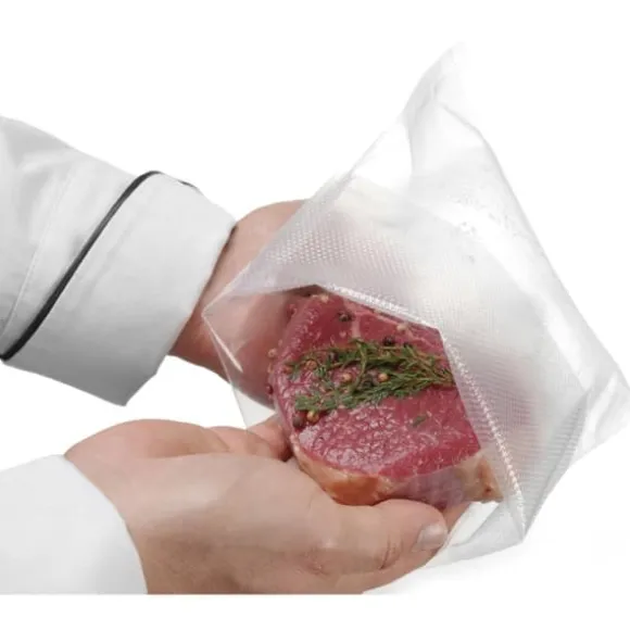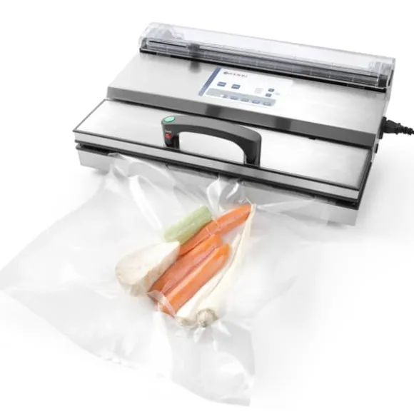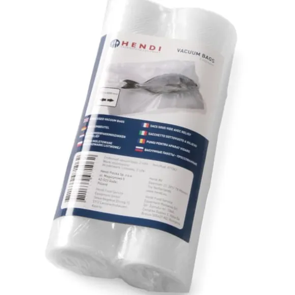 Producentens navn: Hendi 971451 Riftede poser til båndvakuumpakkemaskiner med dimensioner på 280 x 6000 mm af Hendi er designet til professionelle lokaler, cateringvirksomheder og hjemmekøkkener. De muliggør sikker opbevaring af tallerkener og andre fødevarer under afkøling. Egenskaber: – 60 μm indvendigt lag af polyethylen, beregnet til kontakt med fødevarer, – 15 μm ydre lag af polyamid (nylon) øger styrken og sikrer lufttæthed, – total tykkelse 75 μm, – prægninger letter luftudsugningen og opnår et vakuum, – anvendte materialer fungerer som UV-filter, – kan bruges ved temperaturer fra -20 til 110˚C, – velegnet til bånd- og kammerpakkemaskiner, – vakuumpakket mad bevarer sine egenskaber længere, – dimensioner: 280 x 6000 mm. Sættet indeholder: – riflede poser til båndvakuumpakkemaskiner 280x6000mm