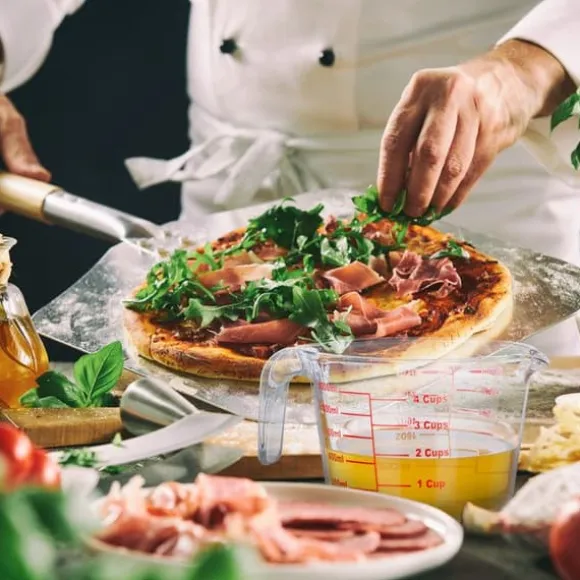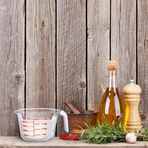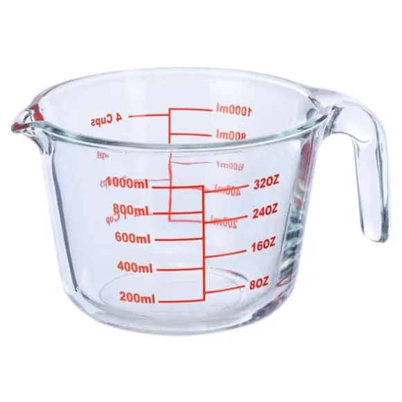 Mätglas för matlagningDen stora mätkannan är det idealiska köksredskapet för att mäta ingredienser när du lagar mat eller bakar. Förutom millilitermätningen har glaset 2 internationella mätlinjer som är lätta att läsa i oz och cups. Tillverkat av värmebeständigt borosilikatglas kan kannan användas både i mikrovågsugnen, ugnen och på spisen. Ett litet handtag och en hällpip underlättar användningen av kannan.