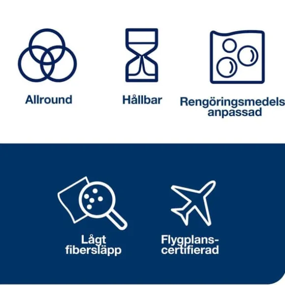 Du minskar även din miljöpåverkan eftersom rengöringsduken är 100% biobaserad*, och förpackningen är gjord av återvunna material. Kostnadseffektiviteten är prioriterad, då den hygieniska utmatningen av en duk i taget minskar avfallet. Dessutom behöver du inte ändra din nuvarande städrutin eftersom dukarna passar med de flesta lösnings- och rengöringsmedel.