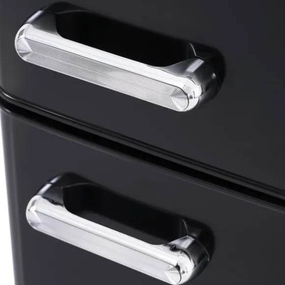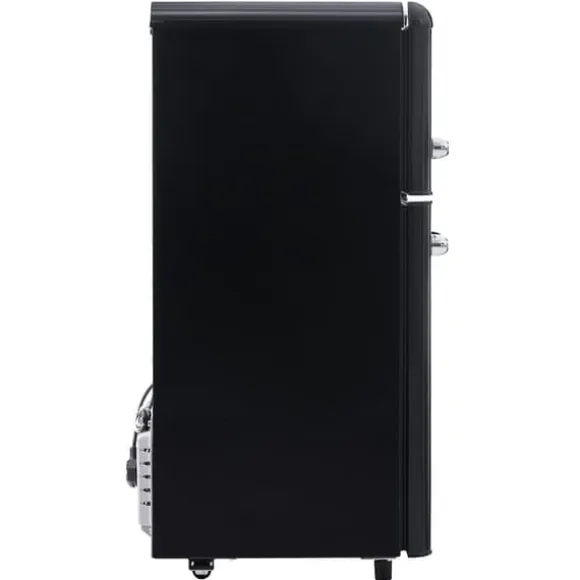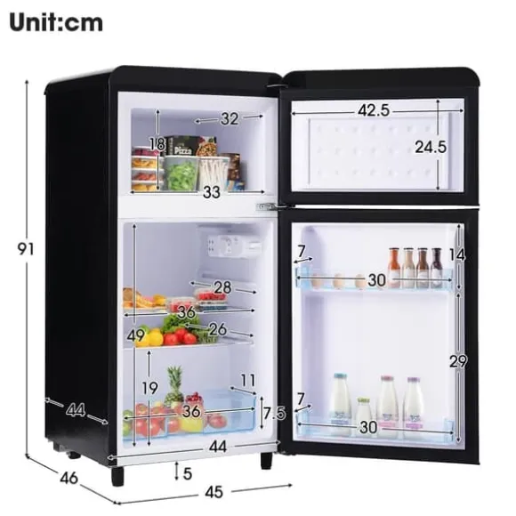 Denna retro kylskåp med dubbel dörr är både stilfull och funktionell. Med ett totalt utrymme på 72 liter, inklusive 21 liter frysfack och 51 liter kylfack, är det perfekt för mindre hushåll eller extra förvaring. Dess kompakta design och justerbara hyllor gör det enkelt att organisera dina livsmedel.