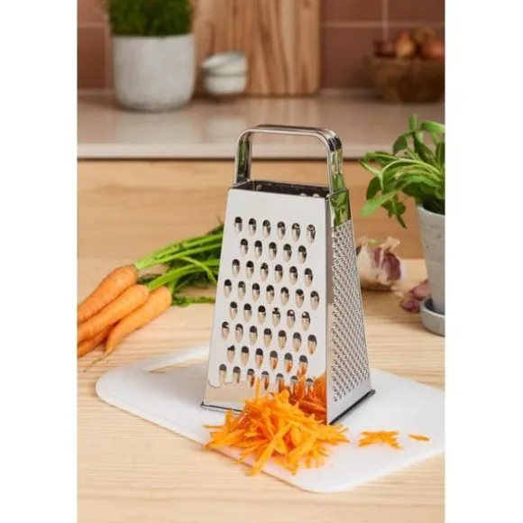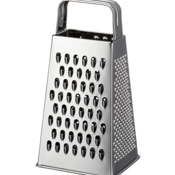 Klassiskt rivjärn / råkostjärn i rostfritt stål. Varje sida har olika rivytor. Fyra rivjärn i ett: grova strimlor, mediumgrova strimlor, fina strimlor, och skivor.