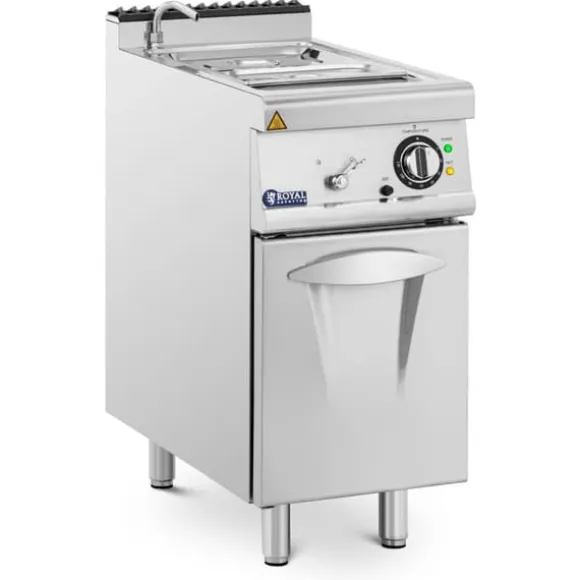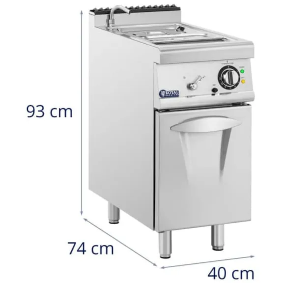 Bain marie från Royal Catering imponerar med sin snygga design och funktionalitet. Med sina kompakta mått på 40 x 73 cm och en höjd på 90 cm passar den eleganta värmebehållaren i de flesta köksenheter. För stabiliteten kan du justera de 15 cm långa fötterna med upp till 3 cm. Det inbyggda skåpet erbjuder ett generöst förvaringsutrymme som är perfekt för köksredskap och annan utrustning. Vattenbadet har plats för en behållare i storleken GN 1/2 och en i GN 1/3. Denna elektriska bain marie med skåp garanterar inte bara ett attraktivt utseende, utan också praktiska lösningar för din köksorganisation.