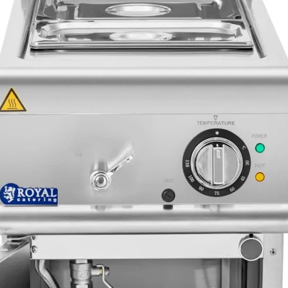 Den elektriska bain marien med skåp imponerar med sin enkla vattenförsörjning, som inkluderar en kran på framsidan, en inloppsslang i skåpet och ett avlopp. Med en kraftfull effekt på 3000 W säkerställer värmebehållaren effektiv värmeprestanda och exakt temperaturkontroll upp till 100 °C. Matvärmaren har även ett överhettningsskydd för säkerheten, vilket garanterar tillförlitlig värmetillförsel. Dessa funktioner gör enheten till den idealiska lösningen för restauranger och matverksamhet som värdesätter kvalitet och säkerhet. Investera nu i denna kraftfulla bain marie och optimera dina köksprocesser.
