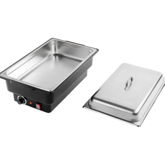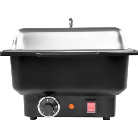 Behöver du hålla maträtter varma under en längre tid, exempelvis på fester, bufféer eller bruncher? Då är en eller flera Chafing Dishes från Royal Catering det riktiga hjälpmedlet! Med den elektriska värmehållaren Chafing Dish kan du servera dina gäster varma rätter, vilka dessutom kan läggas upp och presenteras på ett aptitretande och överskådligt sätt. Chafing Dish RCCD-1/1-100-KS-E har ett hölje tillverkat av plast. En GN-behållare i rostfritt stål, storlek 1/1, ingår i leveransen. GN-behållaren är 100 mm djup och rymmer 13,3 liter. Vilken är teknologin bakom Chafing Dish? Vatten fylls på i värmehållarens hölje och fungerar som ett vattenbad som håller maträtterna i behållaren varma på ett skonsamt sätt. Chafing Dish har en effekt på 900 watt. Vattentemperaturen kan justeras till åtta nivåer mellan 30 och 90 °C.