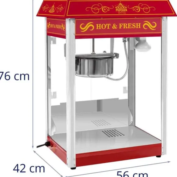 Popcornmaskinen är järnbelagd med hög kvalitet och är väldigt enkel att rengöra. Tack vare det integrerade, kraftfulla uppvärmningselementet som arbetar med 1600 W kan popcornmaskinen snabbt värmas upp till driftstemperatur för en snabbt användning. Lastkapacitet är 16 liter popcorn per timme (ca 5 kg popcorn per timme).