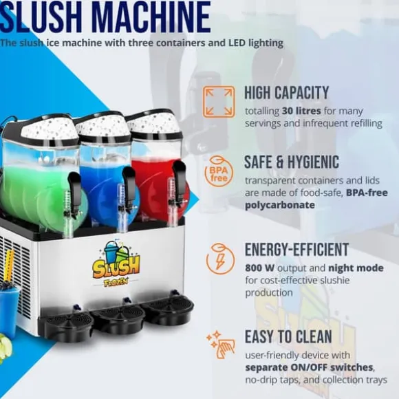 Med slushmaskinen kan du inte enbart servera slush, utan också många andra olika typer av kalla drycker, som fruktdrycker, cocktails eller till och med sorbeter. Med en total kapacitet på 30 liter är slushmaskinen perfekt för förvaring av kalla drycker. Slushmaskinen har tre behållare, där var och en har sin egen motor, så att du kan tillverka olika typer av drycker samtidigt. Blanda till exempel tre olika typer av sirap och skapa din egen slush!