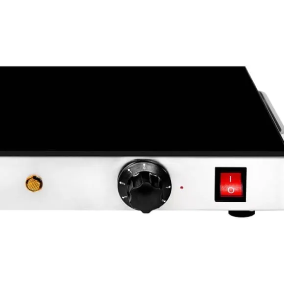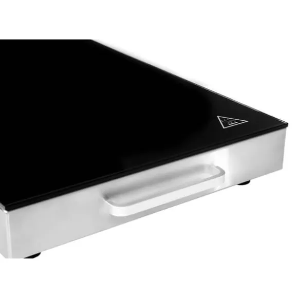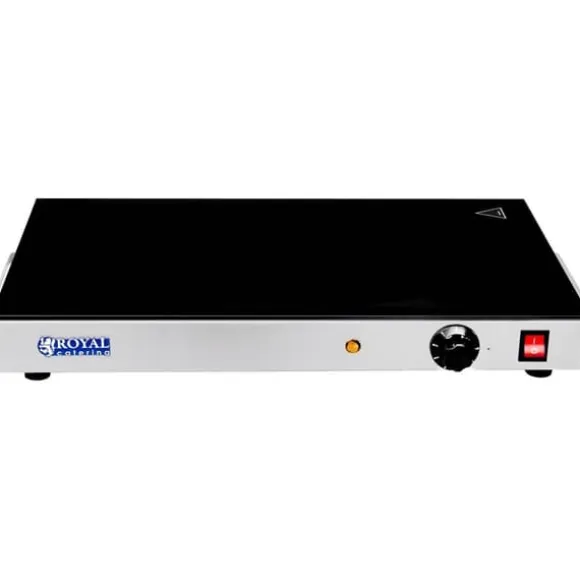 Värmeplattan RCHP-500G från Royal Catering är utvecklad för pålitlig varmhållning av mat. Den hjälper dig att överbrygga tiden från det att en maträtt blir färdig till att den ska serveras. Den här bordsplattan lämpar sig också utmärkt för att användas vid bruncher och bufféer och gör att dina gäster alltid kan njuta av lagom varma rätter. Den stabila och utrymmessnåla plattan har en yta på 53,0 x 32,5 cm och rymmer därmed också serveringfat av större modell. Värmeplattan är tillverkad i rostfritt stål och ytan består av härdat glas. Undertill finns fyra halkfria gummifötter som säkrar att plattan ligger still. Värmeplattan är utrustad med två värmeelement som sörjer för att värmen fördelas jämnt över hela ytan. Temperaturspannet sträcker sig mellan 30 och 85 °C och kan regleras med vredet på framsidan. En lampa visar om plattan är redo för bruk.
