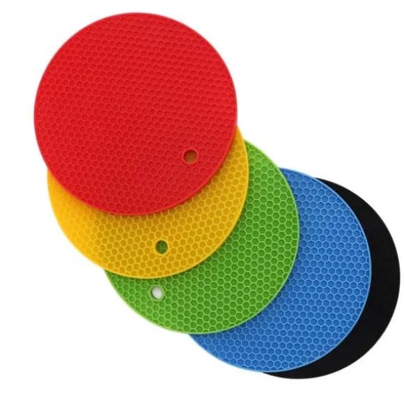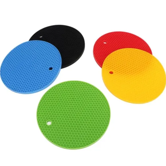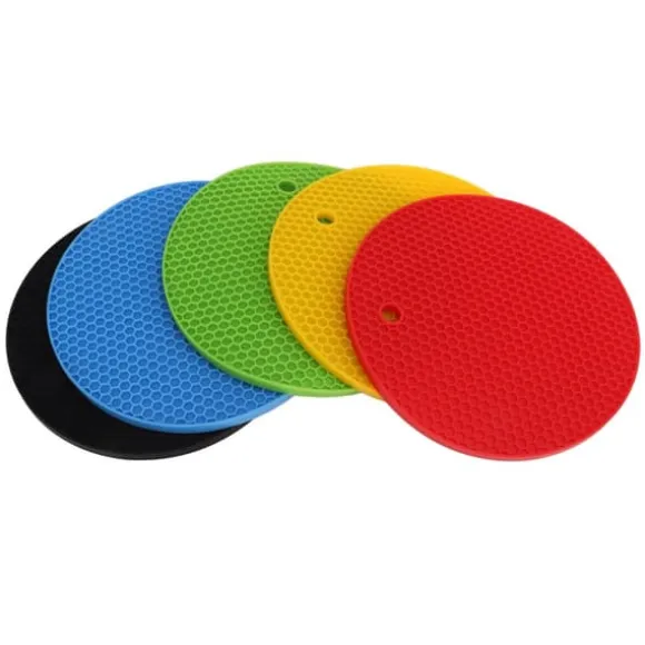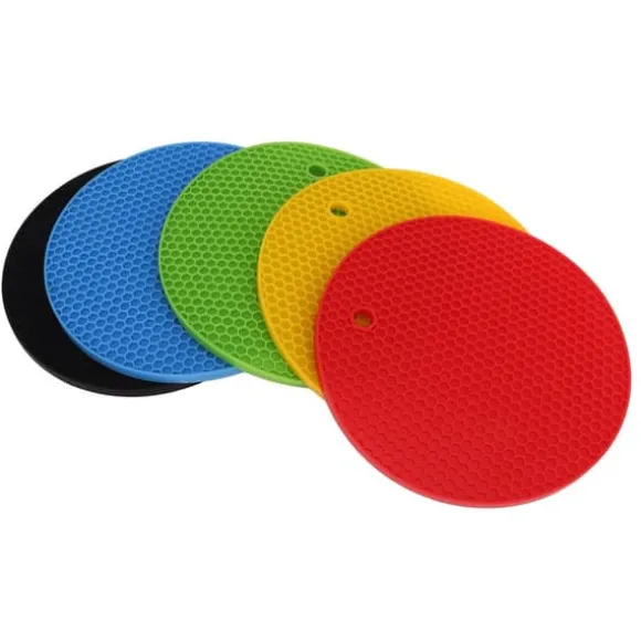 Elektriska kökstillbehör: Varje förpackning innehåller 5 silikonkuddar för att skydda dina ytor och enkel rengöring. Designen med runda hål gör att du kan hänga upp mattorna när de inte används, vilket håller dem rena och lättillgängliga.