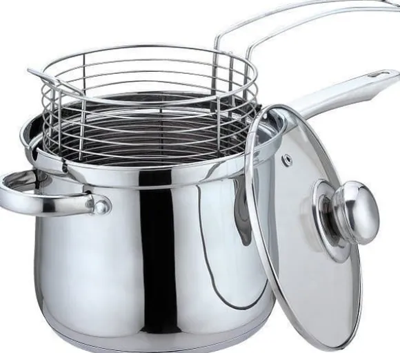 En kastrull av högkvalitativt blankpolerat stål Satsen innehåller en speciell korg med handtag för stekning och matlagning Grytans kant har speciella spår som korgens handtag passar in i, vilket gör att du kan täcka grytan med lock under stekning eller matlagning Du kan fritera pommes frites, kött eller fisk i fett och koka pasta eller grönsaker i vatten. Passar alla typer av spisar, inklusive induktion. cm Korg: diameter 16 x 12,5 cm Kapacitet: 3,6 l