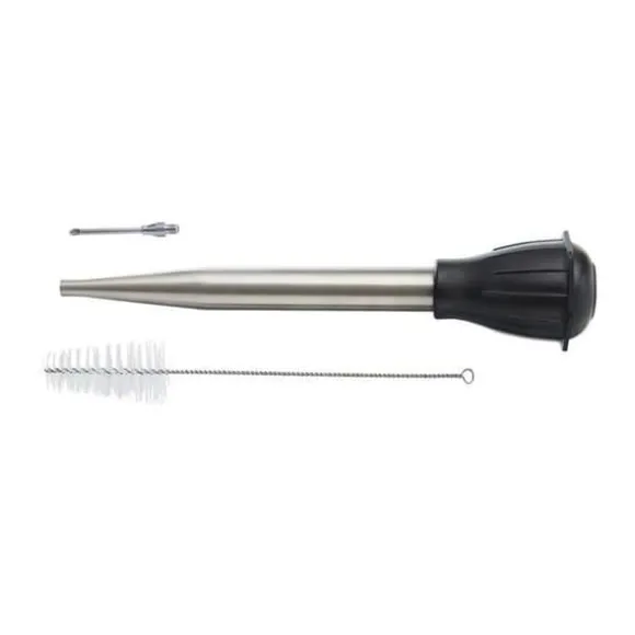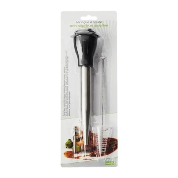 Har du alltid drömt om att få kött perfekt tillagat, mört och inte torrt när du äter det? Den här såsprutan är perfekt för att hjälpa dig att spruta sås på ditt kött under tillagningen. Levereras med en nål och en flaskborste, så kan du också injicera sås under skinnet på din kyckling för att göra den ännu mer smakrik! För att rengöra den räcker det med att du sätter in flaskborsten under en stråle varmt vatten med lite diskmedel. Ett tryck på sprutan räcker för att samla upp safter eller extrahera fettet. Dimensioner på sprutan: 26 x 5 cm.