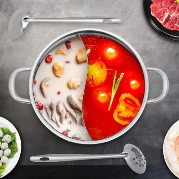 Delad rostfri hotpot 28 cm med glaslockEn modern, tvådelad hotpot i rostfritt stål som låter dig koka två smaker samtidigt – perfekt för familjemiddagar och mindre sällskap. Med 28 cm diameter, plan botten och klart glaslock får du jämn värme, smidig användning och full insyn.