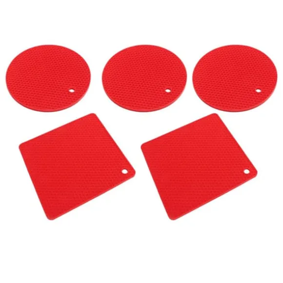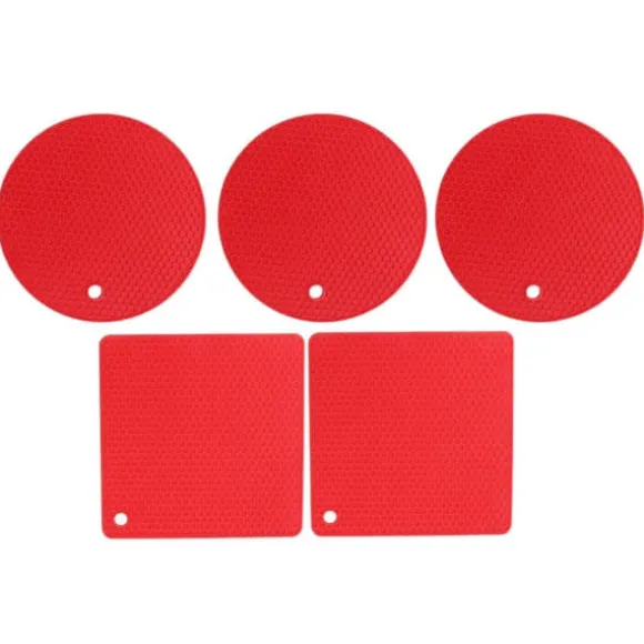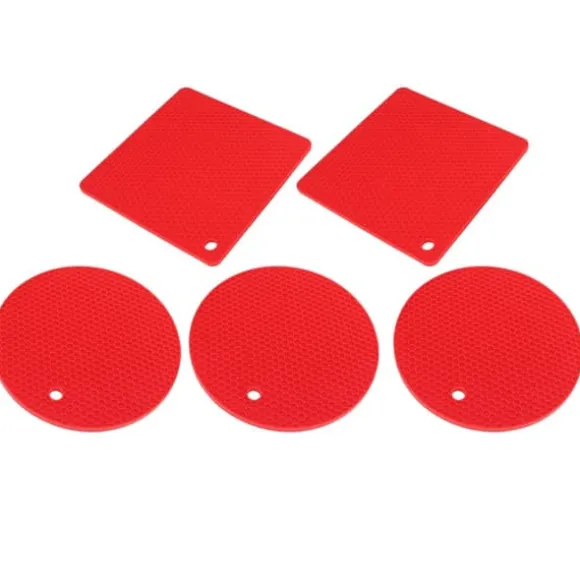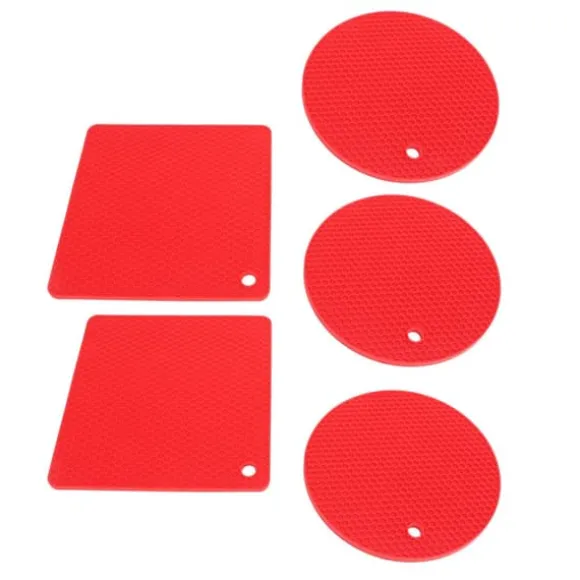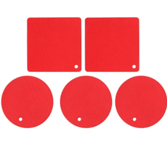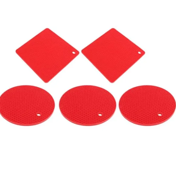– Kökstillbehör: Varje förpackning innehåller 3 runda och 2 fyrkantiga silikonkuddar som fungerar som en skyddande sköld för dina köksbänkskivor. De är säkra att använda i ugnar, mikrovågsugnar, diskmaskiner och kylskåp.