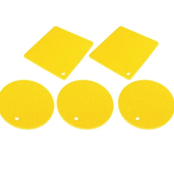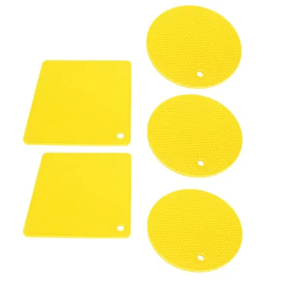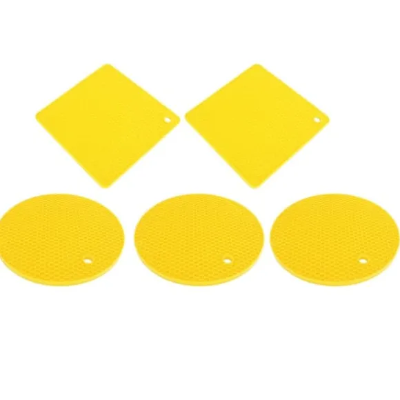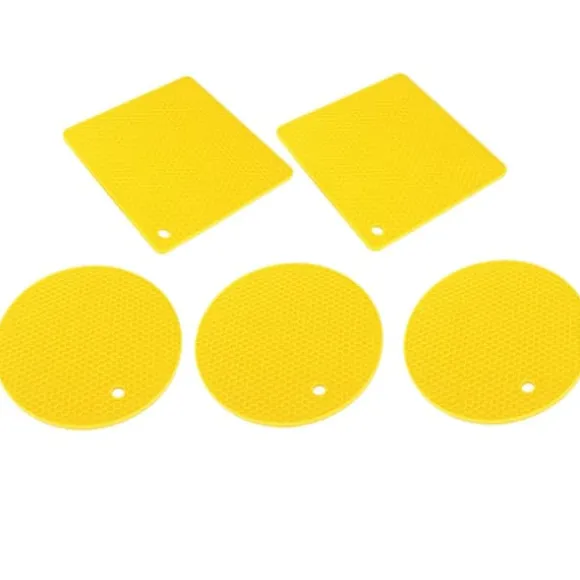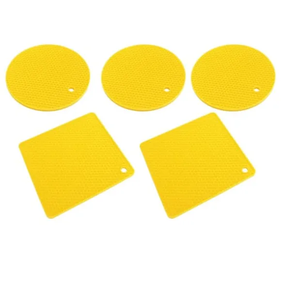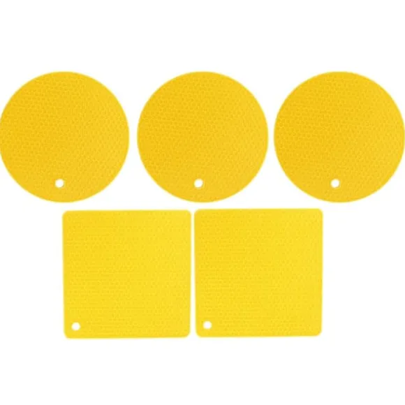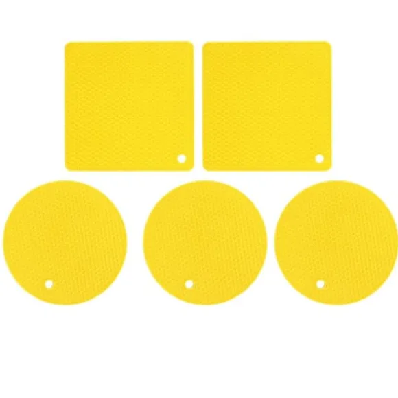 – Varje förpackning innehåller 3 runda dynor och 2 fyrkantiga dynor, som fungerar som skyddande sköldar för dina köksytor. Säker att använda i ugnar, mikrovågsugnar, diskmaskiner och kylskåp.