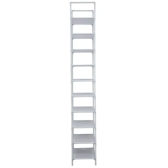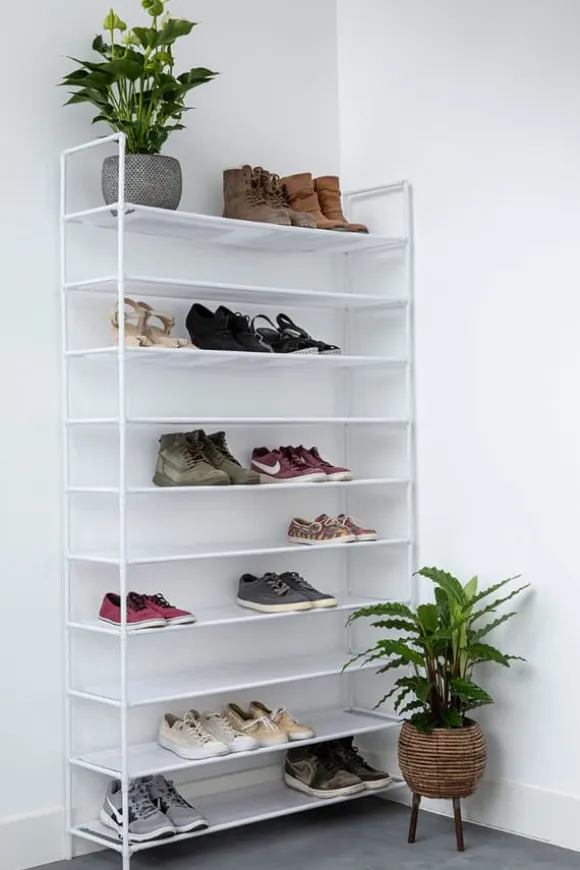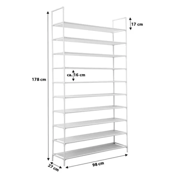 Med detta skoställ i vit metall kan du ge 50 par skor en trevlig plats i ditt hem. Stabil och hög, perfekt om du snyggt vill förvara många skor på ett litet utrymme. Hyllornas fleece är vattenavvisande, så att vatten från blöta skor inte tränger in. Du kan också enkelt torka bort smuts som damm och sand med en fuktig trasa. Benen är gjorda av plast så att du inte repar ditt golv. Du monterar snabbt och enkelt skostället. Stället är flyttbart, men kan även fästas på väggen med de medföljande pluggarna för extra styrka.