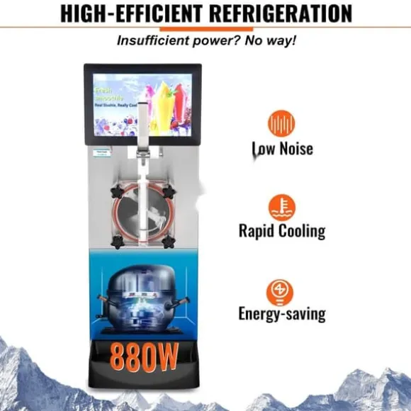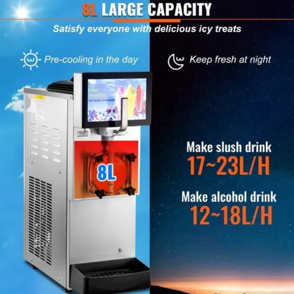 8 L Slushmaskin: En enskalig slushmaskin med en kapacitet på 8 L (2,1 US Gal). Vår kommersiella slushmaskin kan producera 17-23 L slush och 12-18 L alkoholhaltiga drycker per timme, vilket gör att den kan betjäna många gäster samtidigt. Dessutom kan du med förkylning- och bevarande-funktionen förkyla drycker under dagen och bevara friskheten på natten för att bättre bevara smaken. Njut av en uppfriskande dryck när som helst.