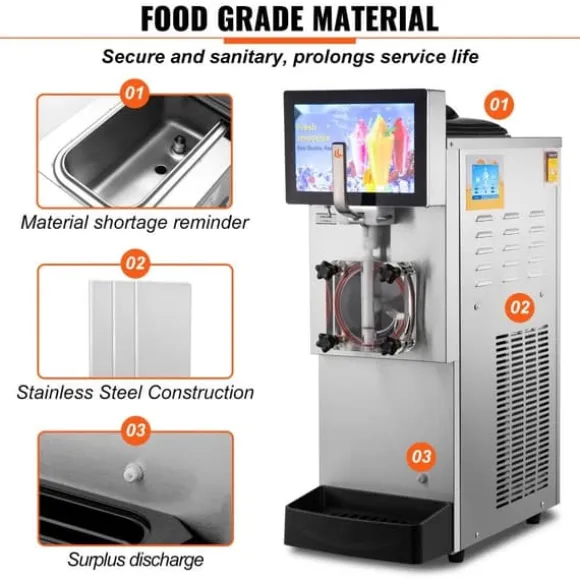 Utmärkt kvalitet: Gör dig redo för en slushmaskin som vet vad du vill ha. Hela slushmaskinen är tillverkad av högkvalitativt rostfritt stål 304, vilket ger utmärkt korrosions- och rostbeständighet, tål högt tryck och är lätt att rengöra. I cylindern finns en indikator som påminner dig att fylla på råvaror i tid; i höljet finns ett litet hål för att tömma kvarvarande ingredienser och förhindra stopp.