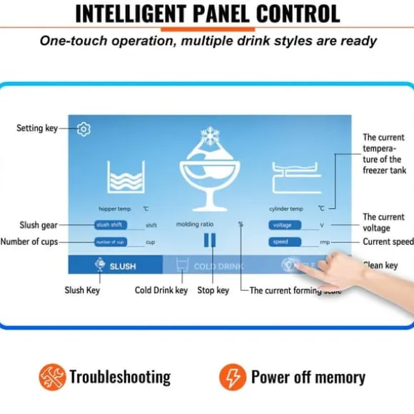 Precist kontrollpanel: Denna slushmaskin är utrustad med ett enkelt och användarvänligt kontrollpanel. Aldrig har det varit så enkelt att justera styrkan på drycken efter dina behov. Med enkel knapptryckning kan du servera dina favorit-isiga drycker. Dessutom finns genomtänkta inställningar för feldiagnos och strömavbrottsskydd.