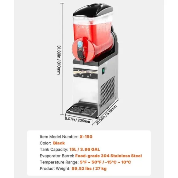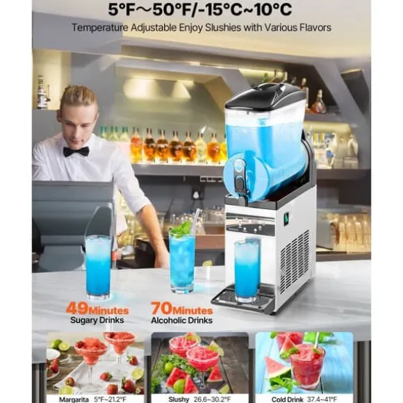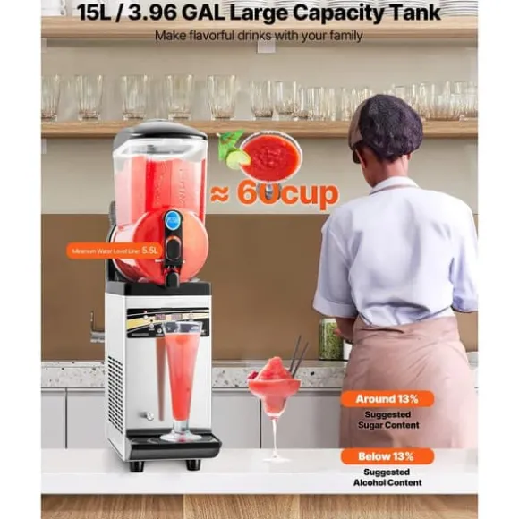 Denna slushmaskin har en imponerande 15 liters enkeltank som kan skapa upp till 60 koppar slushy-drycker per sats. Med olika temperaturinställningar, inklusive slush, kalla drycker och automatisk rengöring, är maskinen lätt att använda och övervaka. Den robusta konstruktionen i rostfritt stål och livsmedelsgodkänd PC-tank garanterar långvarig prestanda och enkel rengöring.
