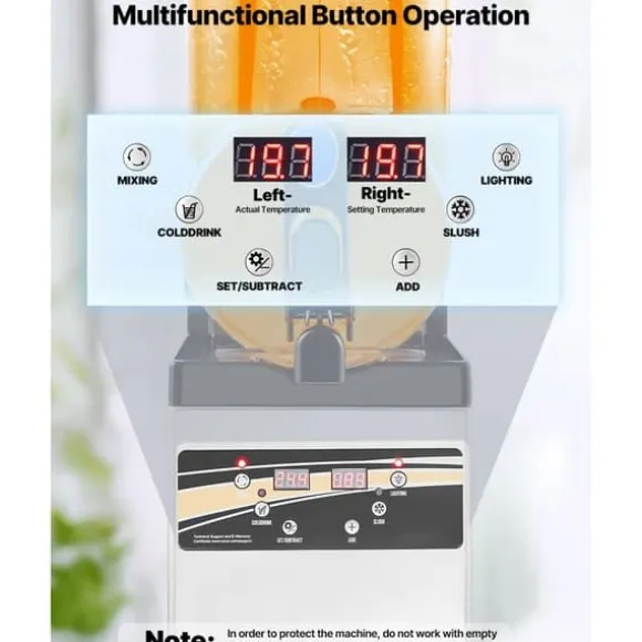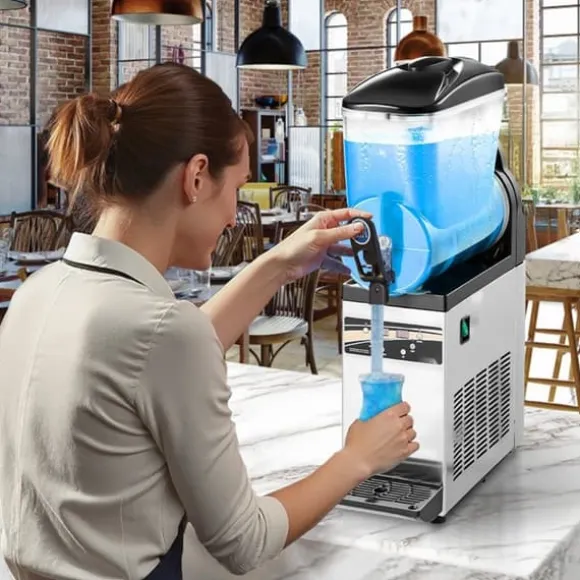 Denna uppgraderade kommersiella slushmaskin är perfekt för att skapa olika drycker och erbjuder en enkel och effektiv lösning för kommersiellt bruk. Med justerbara temperaturintervall och en stor tankkapacitet är denna maskin idealisk för glassbarer, hamburgerrestauranger, kaféer, barer och andra kommersiella miljöer.
