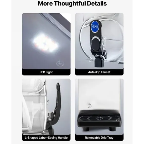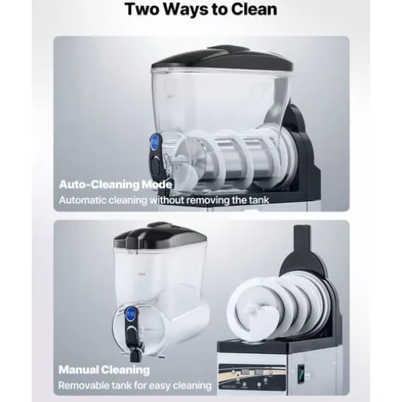 Den automatiska rengöringsfunktionen och enkel demontering av modulära komponenter gör underhåll och rengöring enkelt. Dessutom, med ytterligare funktioner som en droppbricka för att förhindra vattenläckage och halkfria gummifötter för stabilitet, är denna slushmaskin både funktionell och pålitlig.
