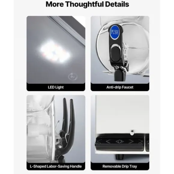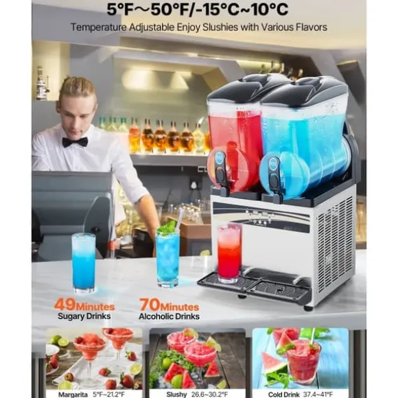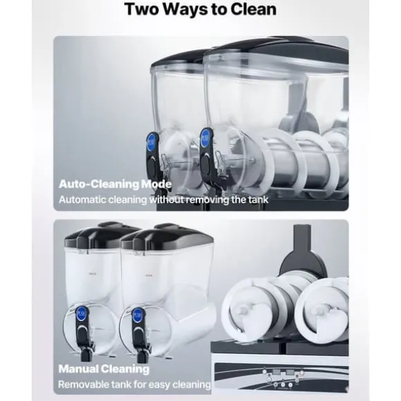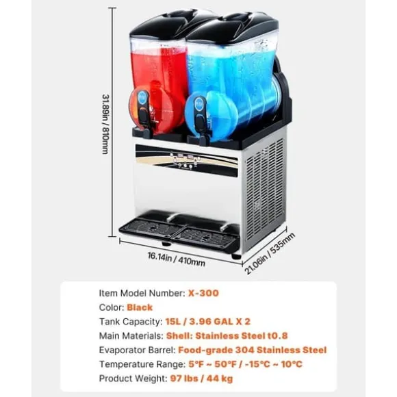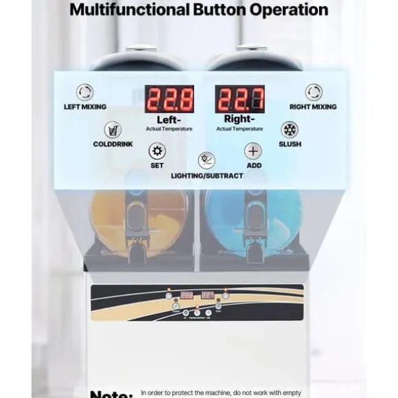 Den justerbara temperaturinställningen möjliggör skapandet av olika dryckesvarianter, som juice, te, margarita och iskaffe. Varje tank på 15 liter ger möjlighet att använda olika blandningar separat för smidig användning. Den användarvänliga kontrollpanelen erbjuder två lägen, temperaturkontroll, och tidsinställningar för förenklad hantering. Tillverkad av rostfritt stål och livsmedelsgodkänt material för enkel rengöring och långvarig användning. Maskinen är också utrustad med anti-dropp-kran, droppbricka, och gummifötter för ökad stabilitet och minimalt vattenläckage.