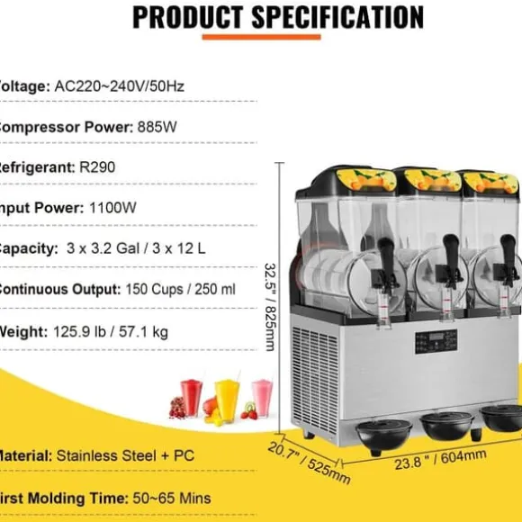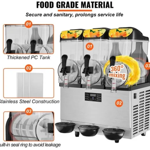 Upptäck vår slushmaskin med tre dryckesbehållare, var och en med en kapacitet på 12 L (3,2 gal). Vår kommersiella slushmaskin kan producera upp till 75 smoothies (500 ml per kopp) på bara en timme, vilket gör att du kan betjäna ett stort antal kunder samtidigt. Dessutom kan smoothies eller alkoholhaltiga drycker tillverkas separat, så att du alltid kan njuta av en uppfriskande dryck när som helst.