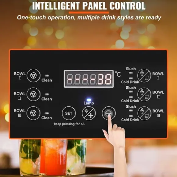 Denna slushmaskin är utrustad med ett användarvänligt kontrollpanel. Varje skål kan styras oberoende av de andra, med en tydlig digital display för snabb överblick. Aldrig har det varit så enkelt att justera hårdheten efter dina behov. Med enkel knapptryckning kan du servera dina frysta favoritdrycker. Det finns även genomtänkta inställningar för självrengöring.