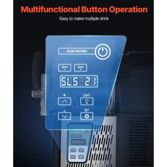 Denna slushmaskin är enkel att använda med en tydlig digital display som visar temperaturen. Den är konstruerad med en rostfri stålkropp och en PC-tank av livsmedelskvalitet för hållbarhet och lätt rengöring. Den har en droppbricka för att förhindra vattenläckage och gummifötter för stabilitet under användning.