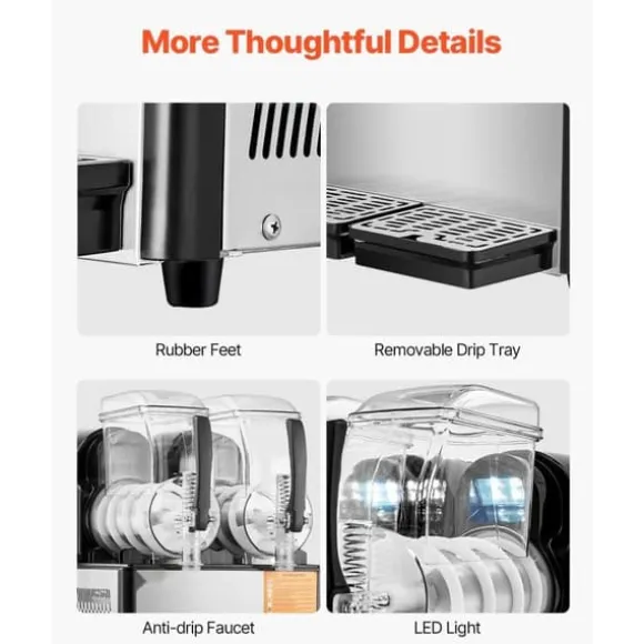 Denna uppgraderade slushmaskin är perfekt för att göra olika drycker med sin justerbara temperaturkontroll. Med 15 olika nivåer (temperaturområde: -11 ~ 5 ℃ / 12,2 ~ 33,8 ℉) kan du skapa den perfekta mjukheten eller hårdheten för dina drycker. Använd 1-2 nivåer för juicedrycker, 3-7 för slushies och 8-13 för Margaritas. De två 4L tankarna kan producera upp till 32 koppar per sats och passar perfekt i glassbutiker, kaféer och barer.