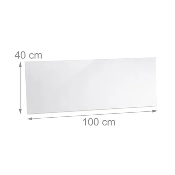 Skydd för köksvägg, transparent stänkskydd, härdat och reptåligt säkerhetsglas, stör ej inredningen, hållbar och lätt att rengöra, stort skydd för spis eller diskho, liten: H x B: ca 40 x 100 cm / ca 6 kg, medium: H x B: ca 50 x 100 cm / ca 7,4 kg, stor: H x B: ca 60 x 100 cm / ca 8,8 kg, härdat säkerhetsglas, transparent, glasskiva med 4 förborrade hål, förborrade hål diameter: ca 9 mm, avstånd mellan borrhål – kant: 3 cm (topp/botten), 5 cm (sidor), paneltjocklek: ca 6 mm, inkluderar monteringsmaterial, illustrerade instruktioner, 100% glas