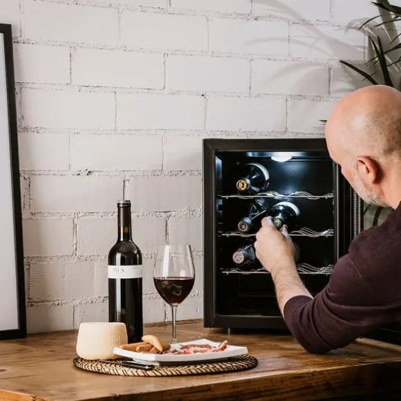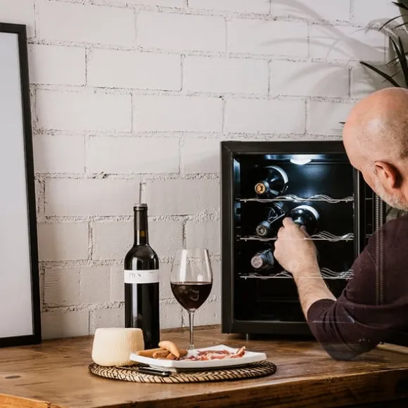 Med antivibrationssystem och dubbel glasdörr helt i svart som förhindrar att vinet blir trött och solens strålar eller utomhustemperaturen kommer in.