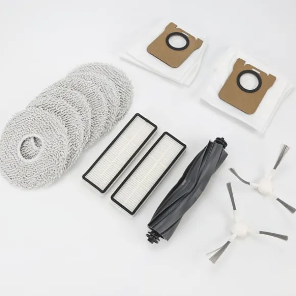 Tillbehörssats för Dreame L10s / L10 Ultra robotdammsugare, innehållande gummiborste, sidoborstar, dammsugarfilter, moppdukar och dammsugarpåsar.