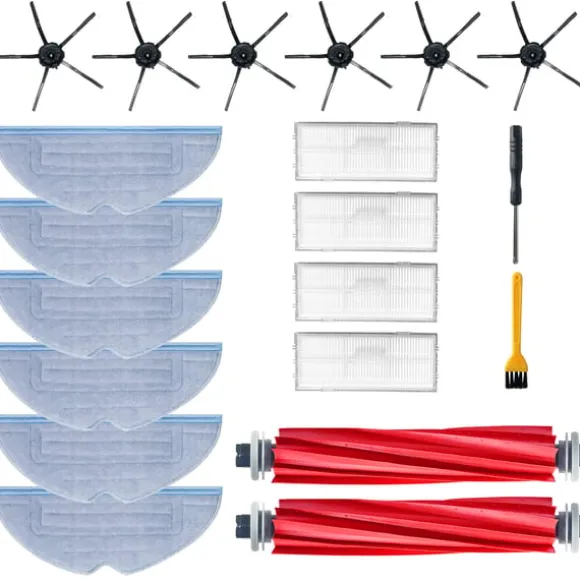 Tillbehörssats för Xiaomi Roborock robotdammsugare, innehållande gummiborstar, sidoborstar, dammsugarfilter, moppdukar, skruvmejsel och rengöringsborste.