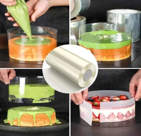 Högkvalitativ, tjock (100 mikron) kantfolie används för att skydda sidorna på kakor, desserter, tårtor och andra delikatesser. Folien gör det lättare att ta ut produkter från kanter och formar och skyddar dem från att torka ut.