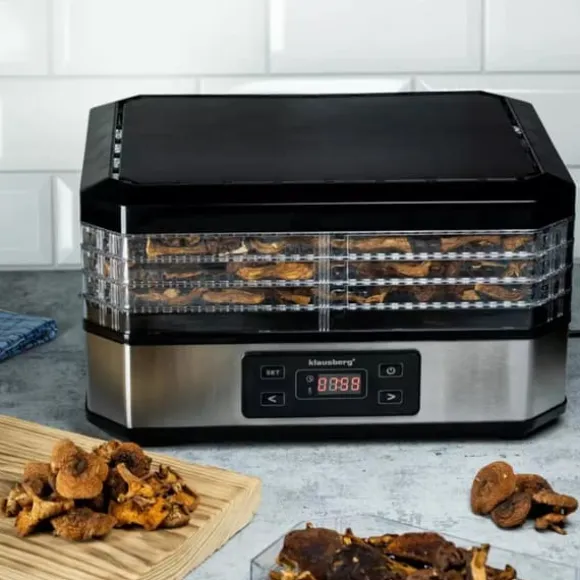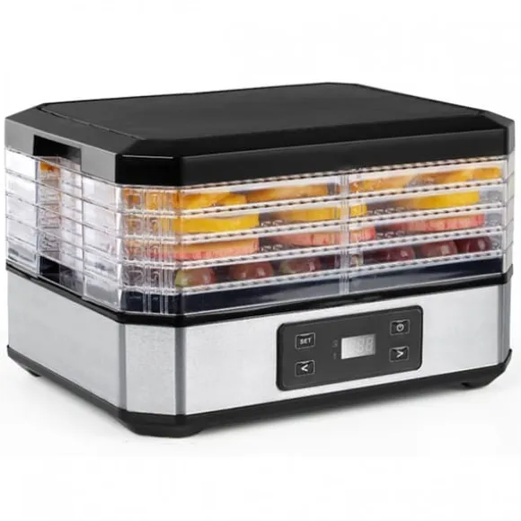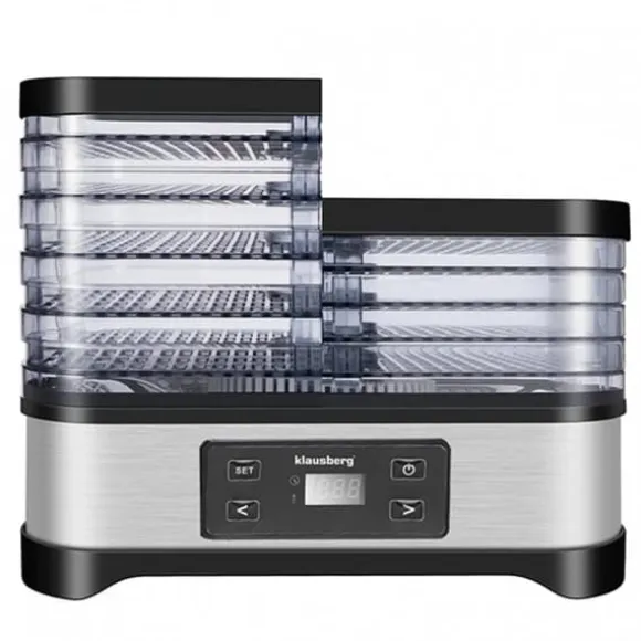 En viktig enhet i varje modernt kök, enkel och säker att använda. Torkar snabbt och effektivt svamp, örter, frukt och grönsaker. Tack vare noggrant utvecklade torkningsparametrar gör det det möjligt att bevara produkternas närings- och smakvärden. Flerskiktsarrangemang av siktar ökar torkningseffektiviteten. Funktioner: – 5 avtagbara, stapelbara mattorkarbrickor. (höjdjusterbar). – Lätt att tvätta torkbrickor – livsmedelskvalitet PP/AS; BPA-fri, rostfritt stål – elektrisk dehydrator på flera nivåer som bevarar en mängd olika livsmedel. – Lätt att använda, med enkel uppstart – intuitiv knapp. – Välj dränering med ett klick. – Justerbar tid 1-48 timmar och temperaturinställning 40-70 grader, låter olika livsmedel torka vid rätt temperatur. – Snabb, torr mat på timmar, inte dagar. Ett enkelt sätt att förbereda läckra, hälsosamma och naturliga mellanmål som bananchips, fruktrullar och beef jerky. – Digital LED-skärm – Strömförsörjning: 220-240 V 50/60 HZ – Effekt: 350 W Vad är torkning? Torkning är helt enkelt uttorkning. Tack vare att cirka 70 % av vattnet i frukt och grönsaker avdunstar, behåller produkterna fortfarande sin hållbarhet. Som ett resultat av vattenavdunstning koncentreras ingredienserna som finns i frukt och grönsaker, varför bland annat torkade produkter alltid är sötare än färska. Hälsa. Om vi torkar våra sommarskördar ordentligt kommer de att bevara alla bioelement, tanniner, syror och karoten till fullo och, vilket är mycket viktigt för att våra tarmar ska fungera, fibrer och pektiner. Deras smak och lukt kommer också att förbli oförändrade.