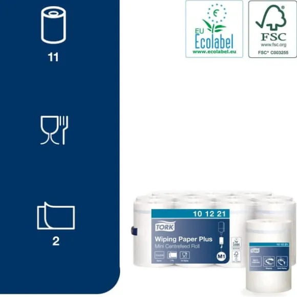 Avtorkningspapper Tork Mini M1 är slitstarkt, mjukt och samtidigt mycket absorberande, vilket ger effektiv avtorkning med mindre avfall.
