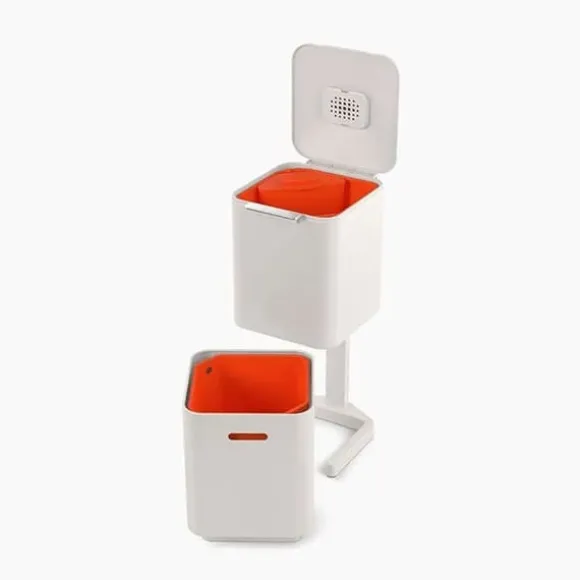 Välj denna selektiva sorteringsbehållare i rostfritt stål. Dess kompakta form erbjuder dock en stor kapacitet på 40L. Två stora kärl på 20L vardera och ytterligare en liten löstagbar behållare för ditt matavfall. Locket har ett kolfilter, som förhindrar obehagliga lukter. Adoptera det, det blir ditt nya väsentliga!