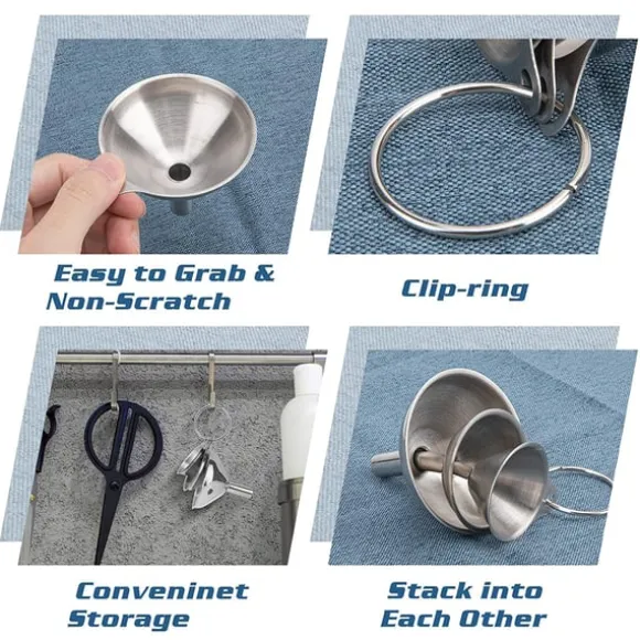 Rostfritt stål: Trattarna är lätta att både rengöra och underhålla i tåligt material. De har en ring som gör de möjliga att hänga upp i köket.