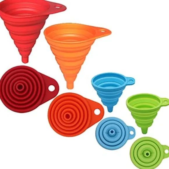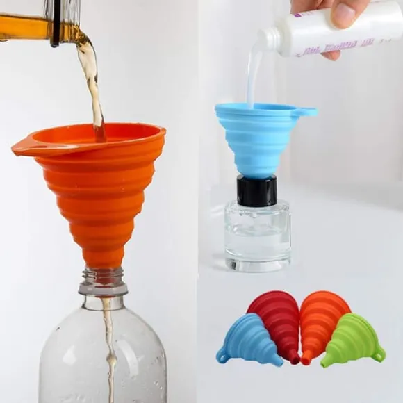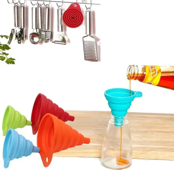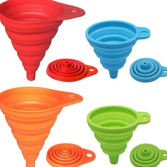 Hopfällbar konstruktion minskar lagringsutrymme dramatiskt jämfört med traditionella trattar. Droppfria kanter eliminerar spill, medan färgkodning (röd, orange, blå, grön) gör storleksidentifiering enkel. Inbyggd upphängningskrok möjliggör praktisk förvaring.