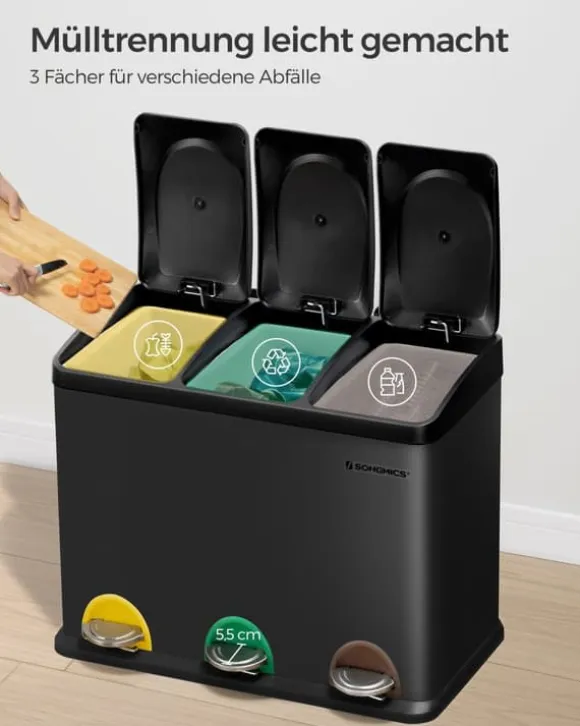 [Optimerad avfallssortering] Denna trippelbehållare har tre 15-litersfack, vilket gör det enkelt att sortera olika typer av avfall och effektiviserar ditt hems avfallshantering[Praktisk färgkodning] Varje fack i denna papperskorg har en färgkodad pedal för intuitiv identifiering och handsfree-användning, vilket gör det enkelt och hygieniskt att sortera avfall[AVTAGBARA INNERHINKAR] Med 3 avtagbara innerhinkar, var och en 7″ x 10,4″ x 16″, förenklar denna 45L pedal soptunna avfallshanteringen. Har påsen gått sönder av misstag eller spillts ut? Ta helt enkelt bort hinken för att rengöra[SOLID OCH LÄTT ATT RENGÖRA] Denna tredubbla återvinningstunna, tillverkad av robust stål och förbättrad med högkvalitativa ytbehandlingar, kombinerar enkel rengöring med långvarig kvalitet, vilket säkerställer att den förblir i orört skick[Estetisk funktionalitet] Med de eleganta måtten 60,5 x 40,5 x 48,5 cm passar denna moderna återvinningstunna perfekt i ditt kök, på bänken eller bredvid kylskåpet, vilket förbättrar dess funktionalitet och visuella charm