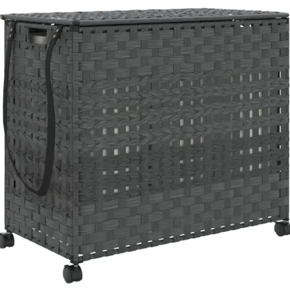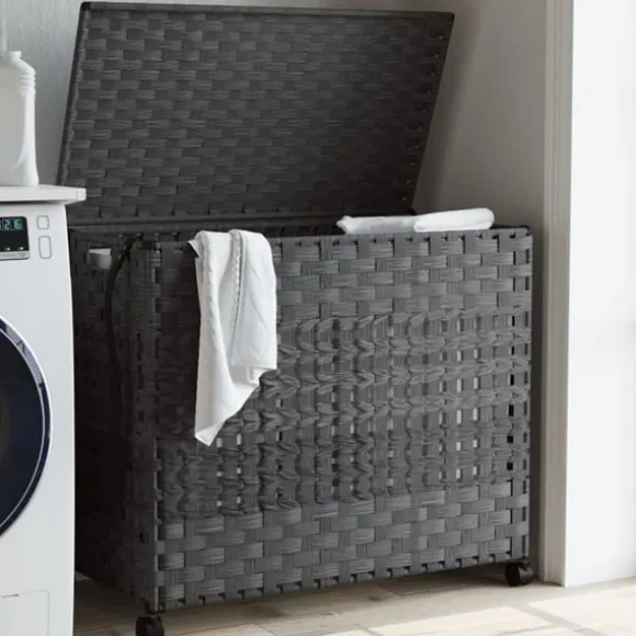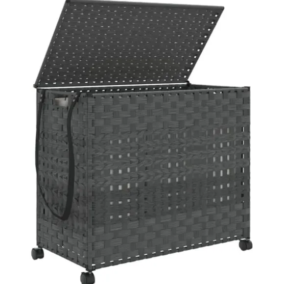- Denna tvättkorg har fyra hjul som gör den enkel att flytta runt Hjulen har bromsar för att hålla den på plats när det behövs.