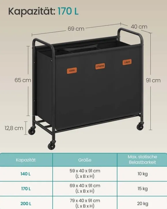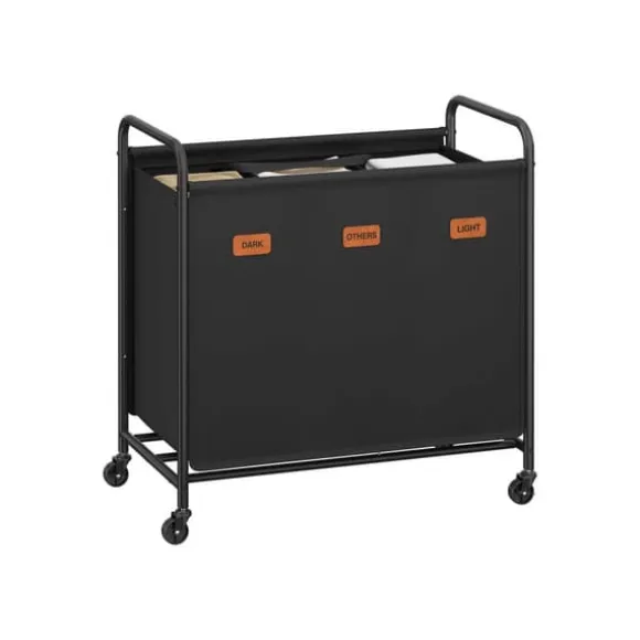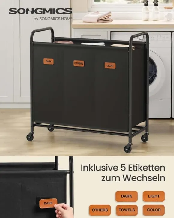 Tvättkorg med hjul och 3 fack i bläcksvart