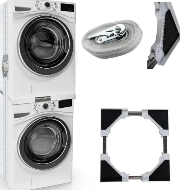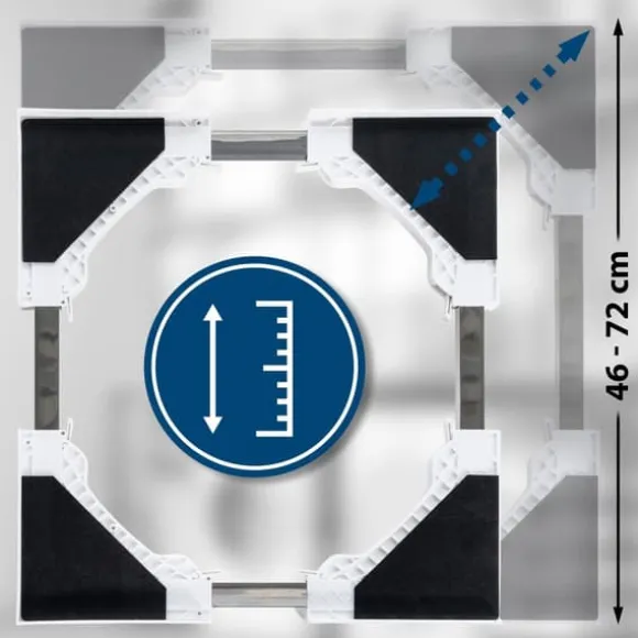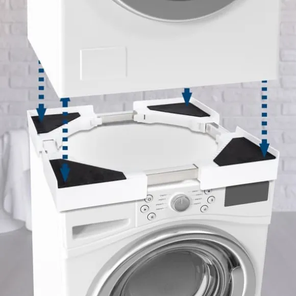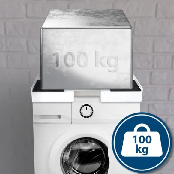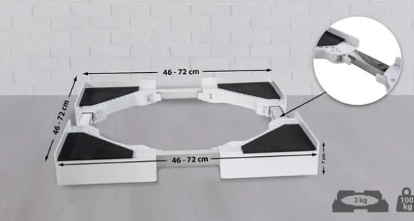 Anslutningsmodul för tvättmaskiner. Denna anslutningsmodul är den rymdsparande lösningen för din tvättmaskin och andra hushållsapparater. Med den här modulen kan du till exempel stapla en torktumlare eller andra lämpliga enheter på din tvättmaskin. Anslutningsmodulen är tillverkad av kallt stål och utrustat med skyddare. Det är också användbart att ett spänningsbälte levereras med vilket de staplade enheterna kan fixas och skyddas. Detta gör detta tillbehör för tvättmaskiner mycket stabilt och dina enheter är inte skadade. Beroende på valet är anslutningsmodulen till exempel justerbar i storlek eller utrustad med en låda .. Detaljer:. Normala (justerbara storlekar). Total höjd: 7 cm. Total bredd: 46 – 72 cm. Totalt djup: 46 – 72 cm. Max. Lastkapacitet: 100 kg. Vikt: 2 kg. Belton. Total höjd: 8 cm. Total bredd: 60 cm. Totalt djup: 55 cm. Max. Lastkapacitet: 150 kg. Vikt: 3 kg. Banham (med låda). Total höjd: 8 cm. Total bredd: 60 cm. Totalt djup: 54 cm. Max. Ramens lastkapacitet: 100 kg. Max. lådans lastkapacitet: 10 kg. Vikt: 5 kg