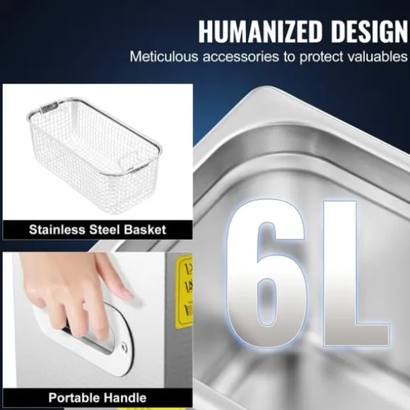 - generös kapacitet: med en rymlig kapacitet på 6l kan du rengöra flera föremål eller större bitar samtidigt, vilket sparar tid och ansträngning.