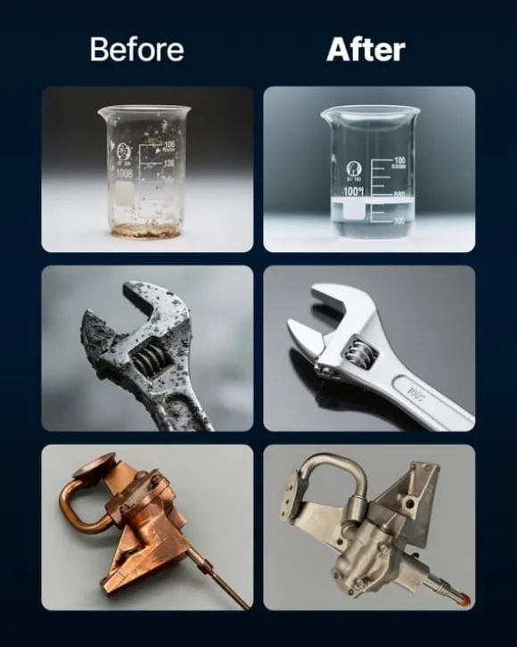 Ultraljudsvågor på 40 kHz skapar täta mikrobubblor som imploderar och “borstar” bort fett och partiklar även inne i kanaler och munstycken. Resultatet blir jämn djuprengöring av förgasare, airbrushar, klocklänkar och små mekaniska delar.