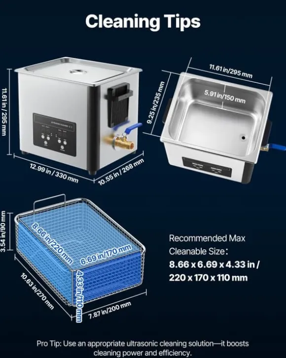 Den generösa volymen rymmer flera delar samtidigt och ger jämn ultraljudstäckning, vilket sparar både tid och rengöringsmedel i verkstaden eller hemma.